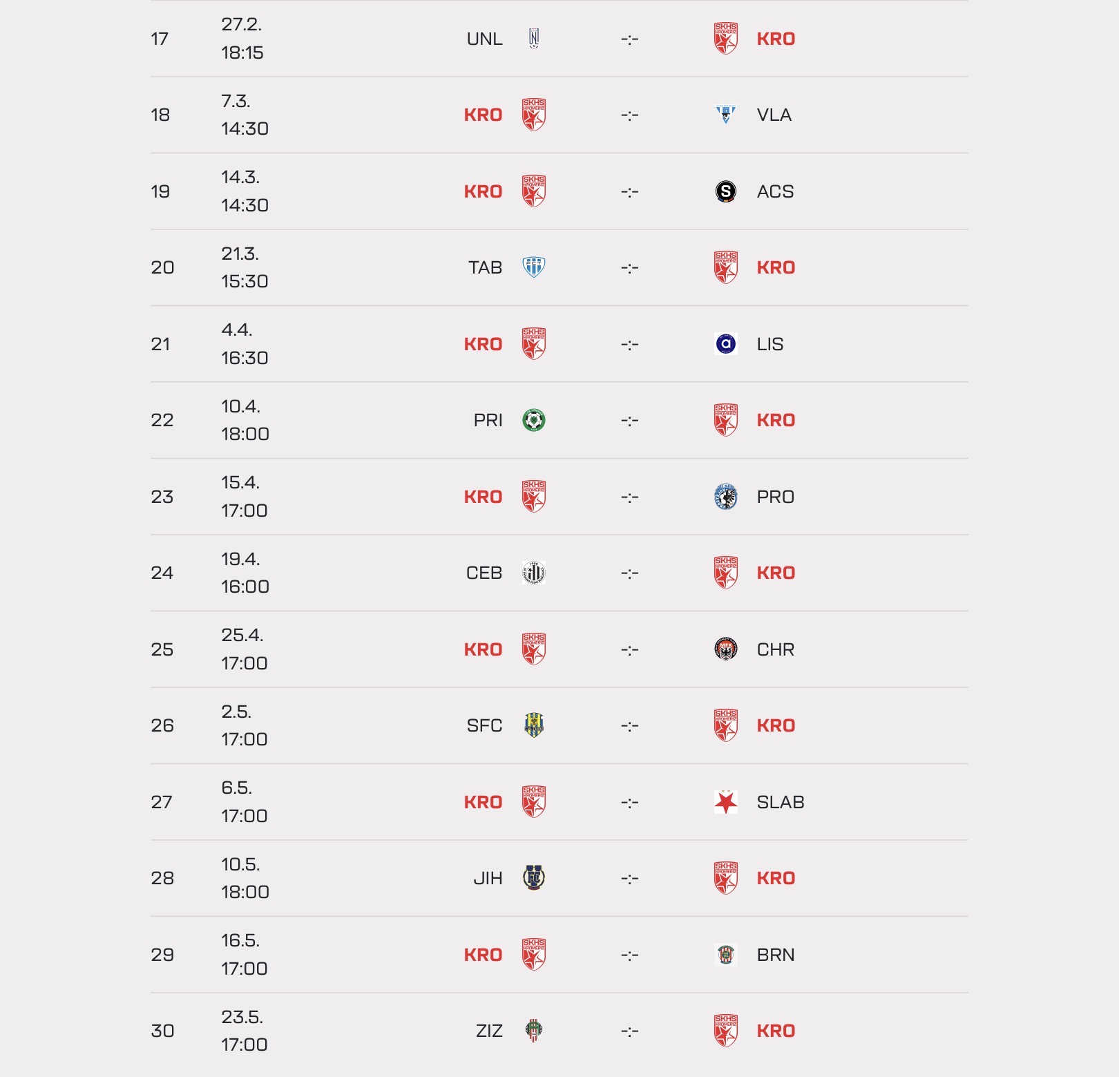 Odstartujeme už koncem února venkovním zápasem v Ústí nad Labem a domácí premiéru si odbijeme hned týden nato proti Vlašimi. V kalendáři si nezapomeňte červeně zakroužkovat zejména atraktivní souboje s rezervami Sparty či Slavie.