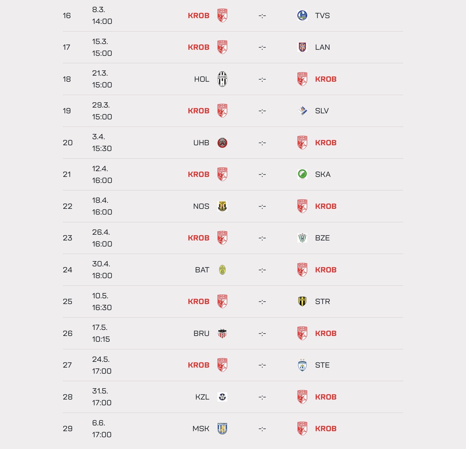 • 16. kolo: Ne 8. 3. (14:00) – Doma vs. Všechovice