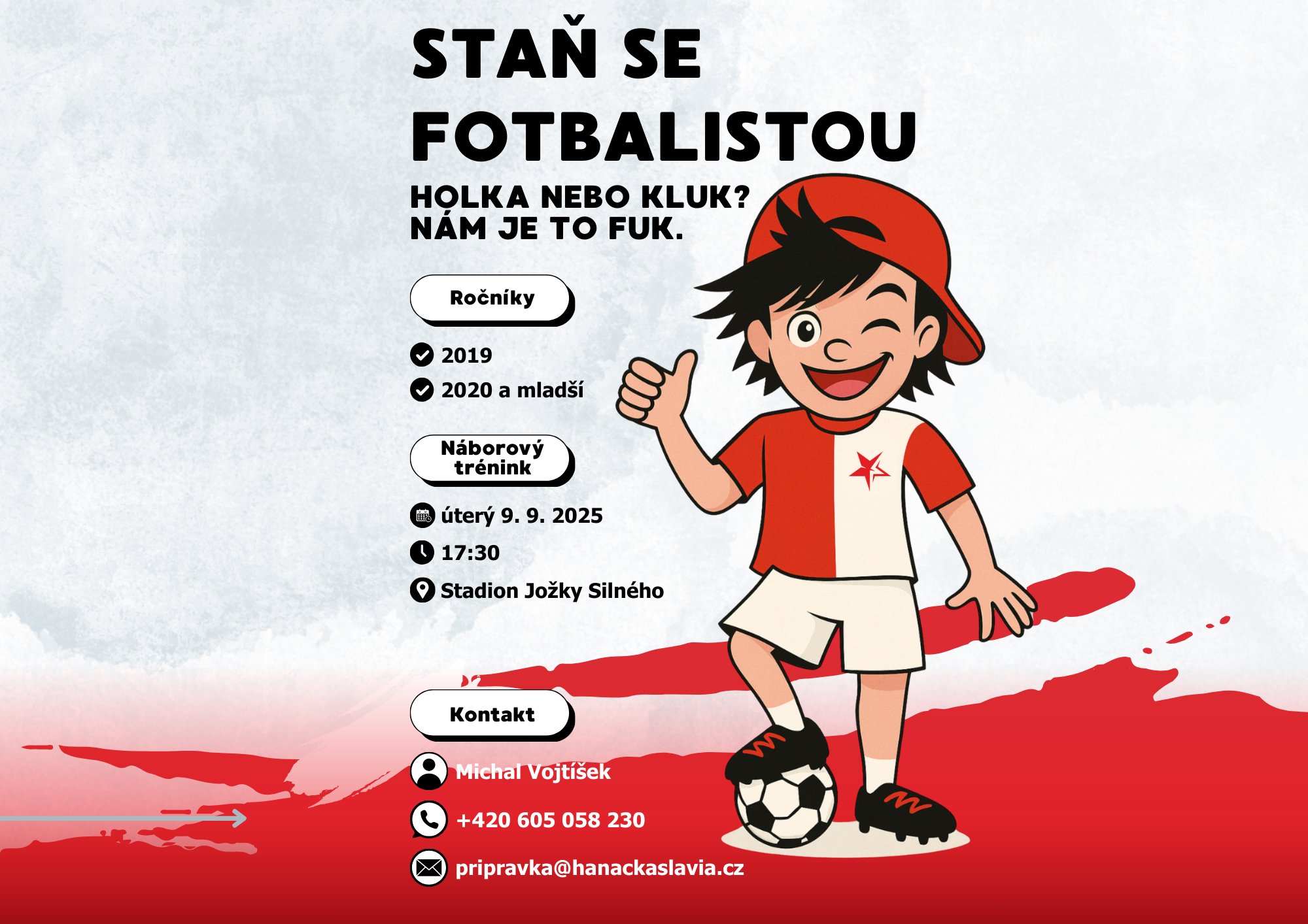 Fotbalový klub SK Hanácká Slavia Kroměříž zve všechny děti na náborový den, který proběhne v úterý 9. září 2025 od 17:30 na hlavním hřišti stadionu Jožky Silného.