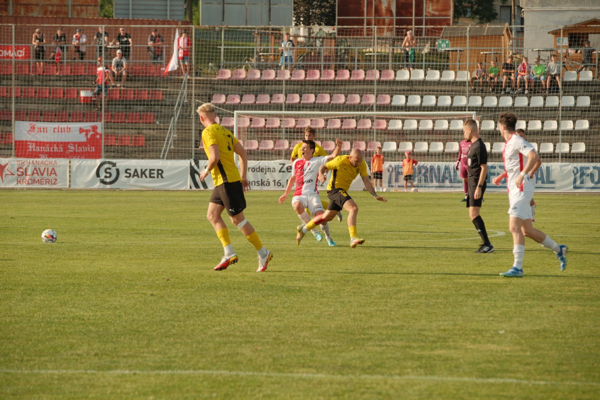 Ze druhé půle uběhlo osm minut a Hanáci už vedli od dva góly. S míčem na noze odvážně vnikl do vápna Holík a levačkou jej poslal neomylně podél brankáře Prodělala do sítě. Domácí druhá branka viditelně povzbudila a krátce na to se po pěkné kombinační akci ocitl v šanci Koryčan, ale přestřelil bránu. I chvilku později se do další šance dostal nabíhající obránce Vyhlíd, ale levačkou mířil jen do boční sítě. Na druhé straně si oddechli domácí, když centrovaný míč před jejich bránu těsně minulo až trio nabíhajících hráčů. V 66. minutě zahrával volný přímý kop z poměrně velké vzdálenosti Dominik Kříž, většina aktérů utkání předpokládala spíše centr, ale Kříž to prudkým obloučkem poslal přímo na branku a míč se od břevna odrazil za brankovou čáru. Stav 3:0 už dával tušit, že domácí kráčejí za bezpečnou výhrou. Kaňkou na jejich výkonu bylo zbytečné vyloučení stopera Gabryše po dvou žlutých kartách. Tu druhou obdržel za faul v 70.minutě, když si předtím záložníci a stopeři Hanáků zbytečně komplikovali rozehrávku na půli hřiště. I tak se Hanáci dočkali ještě jedné vstřelené branky. Po krásné narážečce se k míči uvnitř vápna dostal Cupák a jemně špičkou kolem brankáře vstřelil čtvrtou branku domácích. Hosté s převahou jednoho muže v poli se snažili alespoň o vstřelení branky, ale to se jim dnes nepodařilo. Po rohovém kopu musel nepříjemný prudký tečovaný míč chytat pozorný brankář Dostál, který pak ještě výborně vyběhl a zneškodnil šanci Černému. Kromě výhry a tří bodů ho tak může těšit také další vychytané čisté konto. .