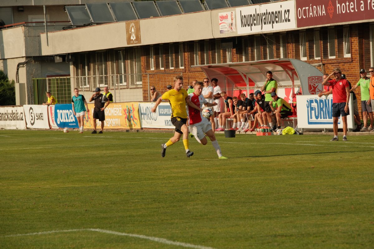 Brno přivezlo do Kroměříže velmi mladý tým doplněný zkušeným exligovým Peterem Štěpanovským. Samotné utkání začalo smolně pro domácího kapitána Tomáše Jelečka, který musel hned v 11. minutě odstoupit pro zranění. Místo něj nastoupil africký mladík Bewene. I přes velké horko se hrál běhavý fotbal a útoky se přelévaly ze strany na stranu. V 18.minutě unikl hostující obraně Koryčan, který byl následně faulován ve vápně a domácí kopali penaltu. Míč si vzal Dominik Kříž a bezpečně proměnil. Oba celky se kromě aktivní kombinační hry pokoušely o zakončení. V šancích, kterých během první půle nebylo až tak moc, se prezentovali pozornými zákroky oba brankáři.