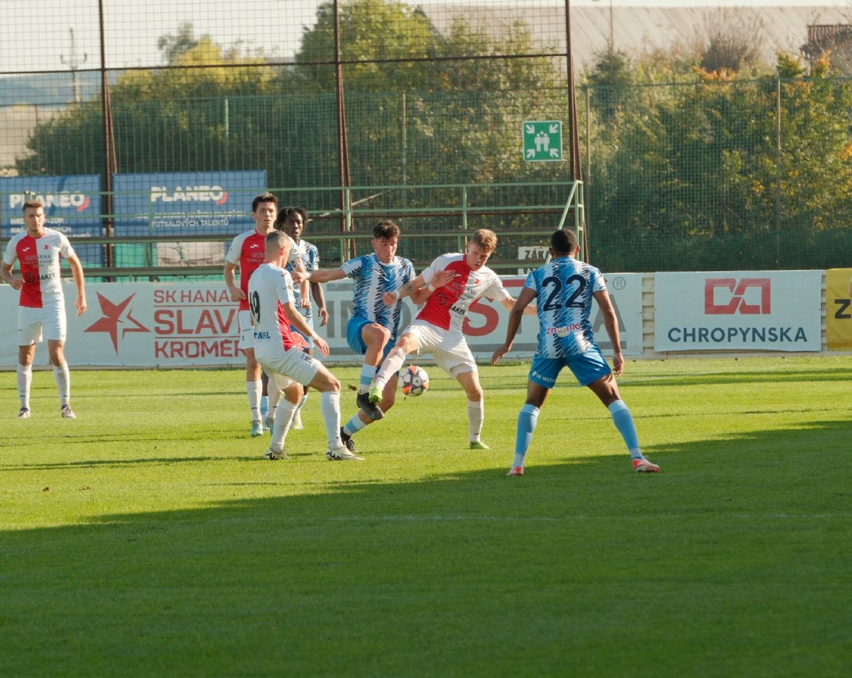 Kroměříž v MSFL dál drží letošní neporazitelnost, potřetí za sebou zvítězila o jediný gól. Hanáci i tak napínavou koncovku zvládli a zaknihovali důležité tři body. Úvod byl ale opatrný, bez vážnějších šancí. První příležitost v zápase měl na kopačce domácí Moučka, ale neuspěl. Znojmo odpovědělo centrem Viegase. Bráněný Vilela se ale k míči nedostal. Skóre otevřel až ve 34. minutě Chwazcz. Domácí forvard se prosadil po rychle rozehrané standardní situaci a po přihrávce Holíka z levé strany, když míč zblízka zatloukl pod břevno. Kroměřížský forvard mohl na konci první půle přidat druhý gól, ale brankář Cruz domácího střelce vychytal. Neuspěl ani Holík. Hanáci se ve druhé půli zaměřili na bránění těsného náskoku, pečlivou defenzivu. Znojmo se snažilo o vyrovnání, více se tlačilo dopředu, ale složitě se prosazovalo. Favorit vyrážel ze zabezpečené defenzivy, hrozil hlavně z brejků. Znojmo zahrozilo jenom střílenými centry, žádnou tutovku nemělo. Domácí měli utkání pod kontrolou. Rozhodnout mohl střídající Bartoš, ale v jasné šanci neuspěl. Vzápětí byl navíc po tvrdém skluzu vyloučen a Kroměříž dohrávala v deseti. Hubený náskok 1:0 nepustila a dál bez prohry vládne třetí lize.